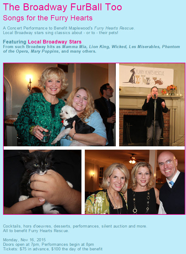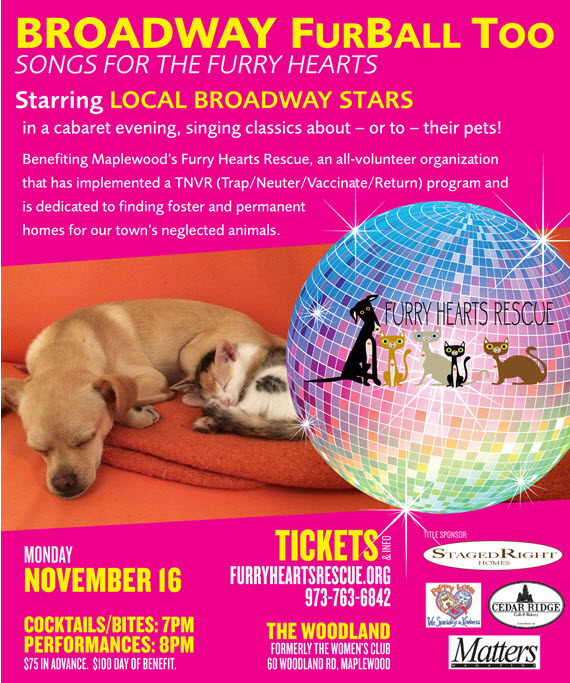 One of the benefits of a community like Maplewood/South Orange is its proximity to NYC and that means that we have a lot of Broadway performers that will happily share their acting and singing with us. So, join us for the Second Annual Broadway FurBall, when Local Broadway Stars from such Broadway hits as Mamma Mia, Lion King, Wicked, Les Miserables, Phantom of the Opera, Mary Poppins, and many more sing classics about – or to – their pets!