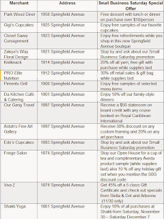 Kick off your Holidays on Springfield Avenue on with special Small Business Saturday savings and holiday treats on Saturday, November 30th. You’ll find over 25 businesses offering you specials savings, merchandise and refreshments while you shop, dine and prepare for the Holiday season. This is your chance to kick off your holiday shopping and support your local merchants. See the list of participating merchants below and look for this poster in the windows of participating merchants.